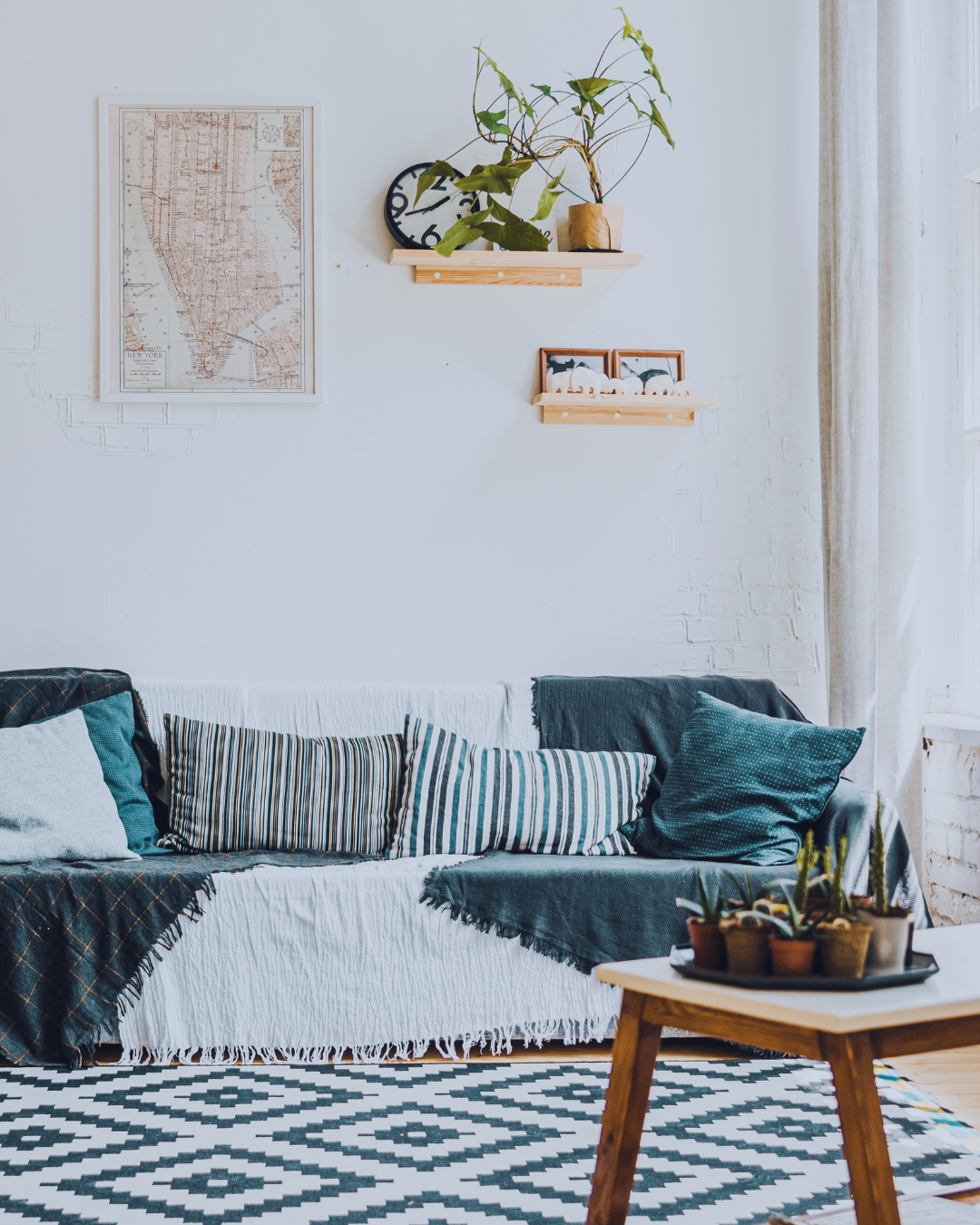 - Dobierz kolory kontrastujące z sofą (np. szara kanapa + musztardowe i butelkowo-zielone poduszki).